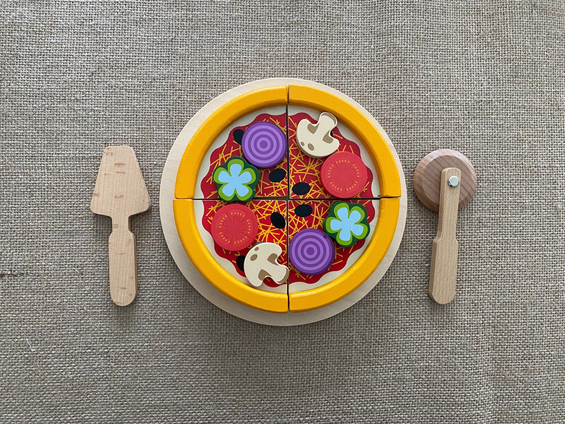 Une belle pizza en bois solide, facile à manipuler et parfaite pour jouer au restaurant, à la cuisine ou au marchand. Les enfants adorent partager les parts entre amis ou en famille.