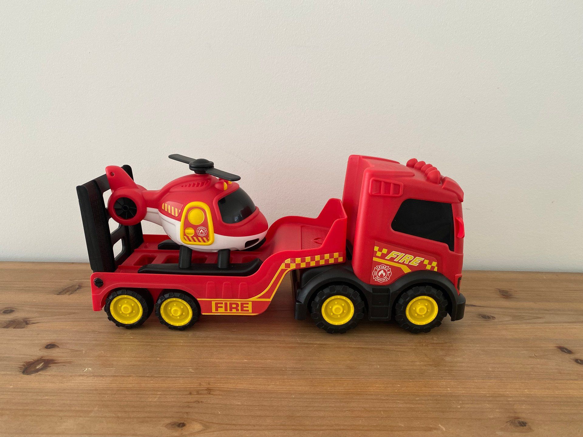 Camion de pompier avec hélicoptère en plastique, d’occasion. Jouet léger et amusant pour des histoires de sauvetage pleines d’imagination.