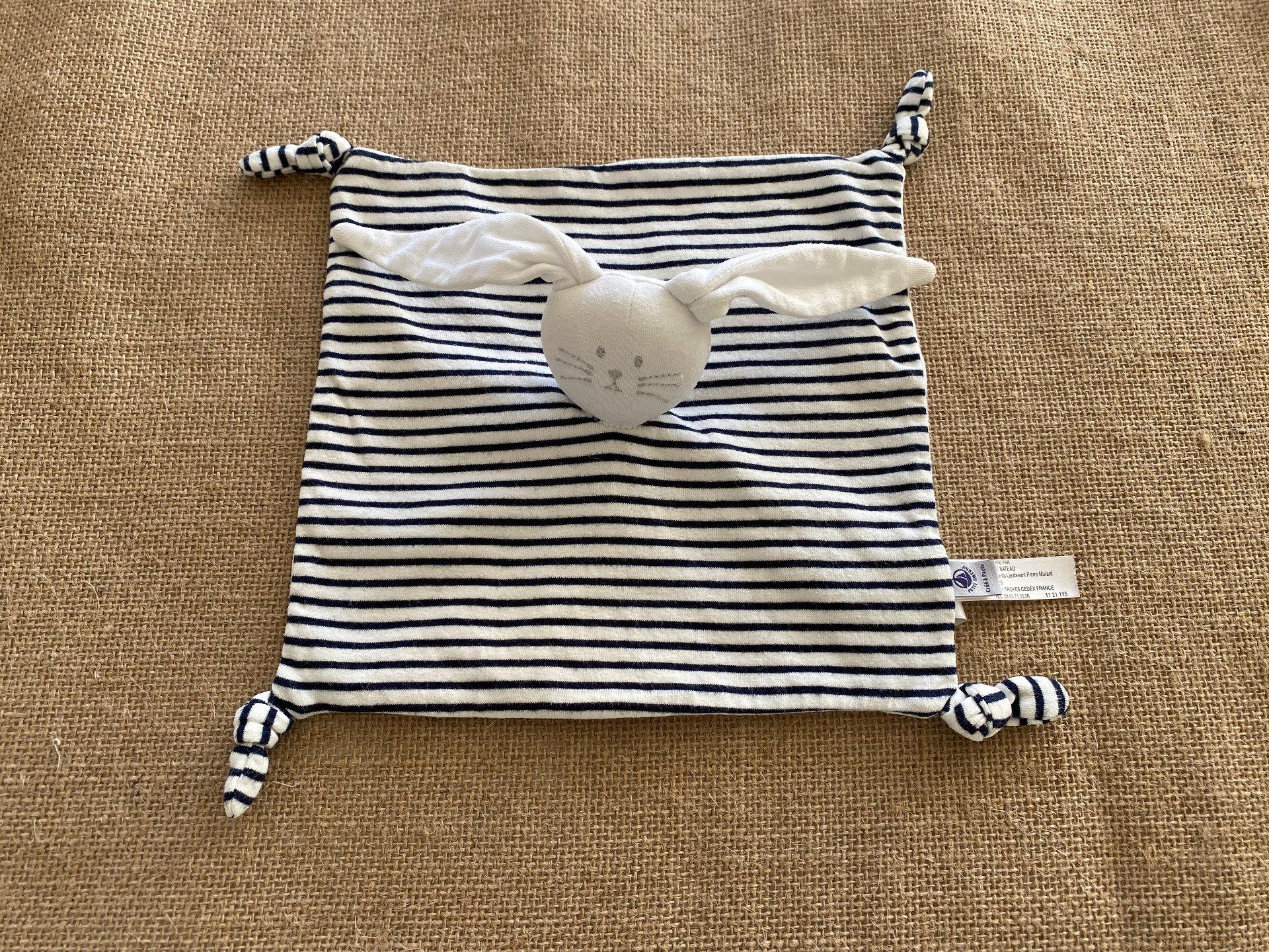 Doudou plat lapin rayé blanc bleu marine Petit Bateau d'occasion