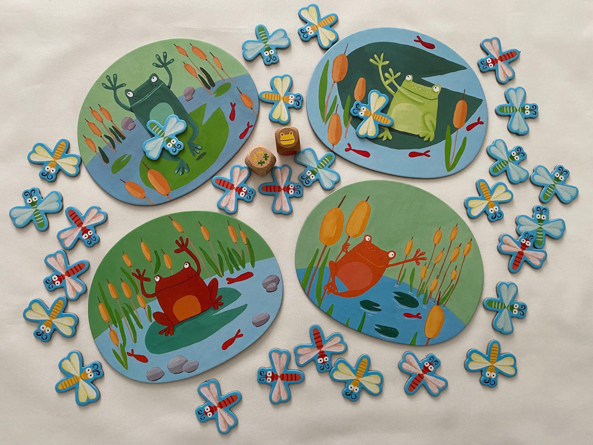 Au fil de la partie, les enfants observent les libellules qui virevoltent au dessus de l’eau tandis que les grenouilles, bien cachées dans les roseaux, attendent le bon moment. Le but est de rassembler sur son nénuphar les libellules correspondant aux bonnes couleurs pour gagner.
