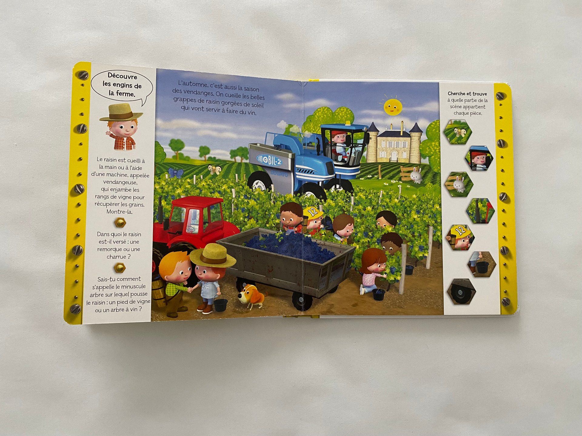 À travers différentes scènes de la vie à la ferme, l’enfant apprend à reconnaître les engins agricoles et enrichit son vocabulaire en s’amusant.