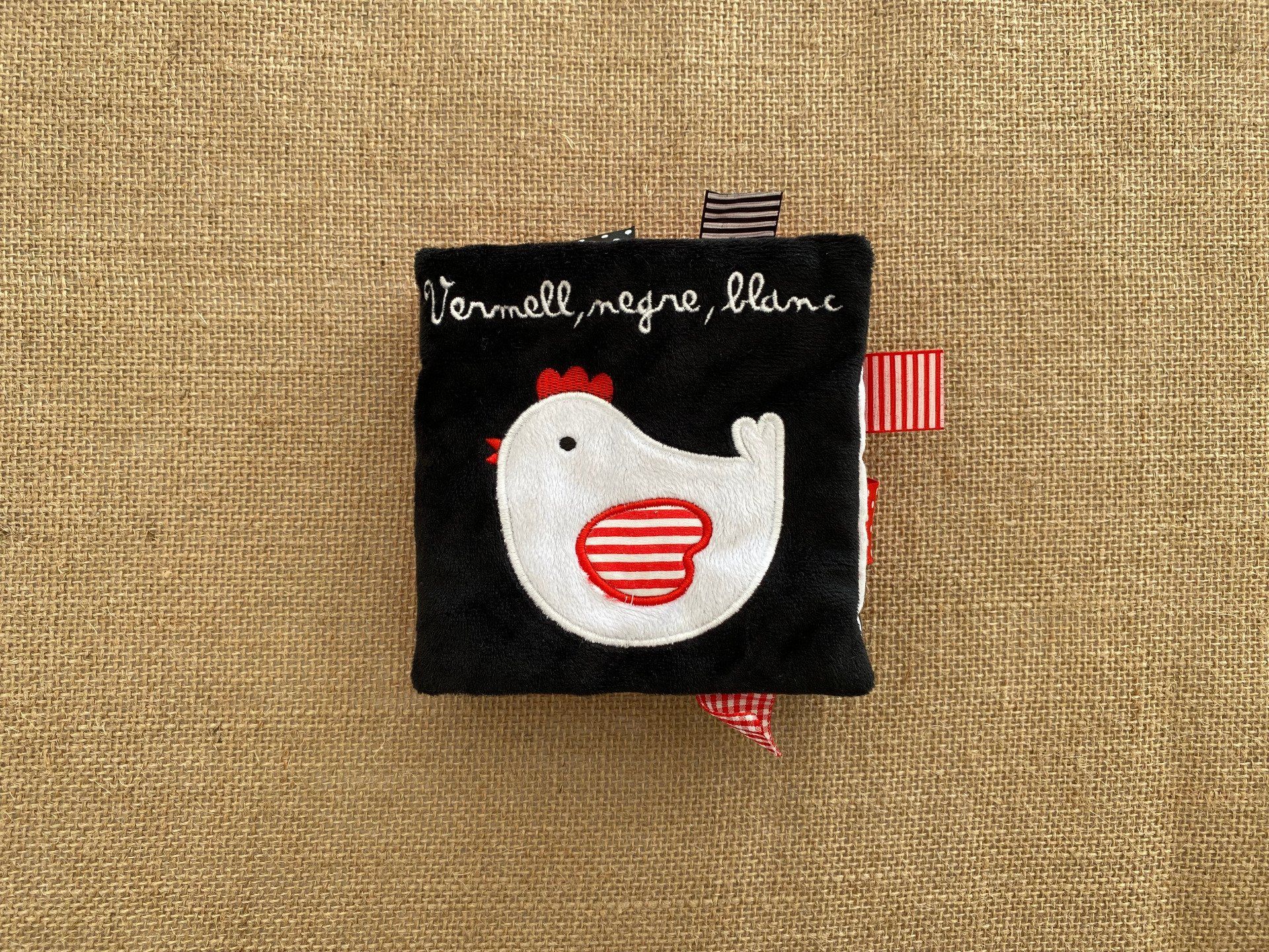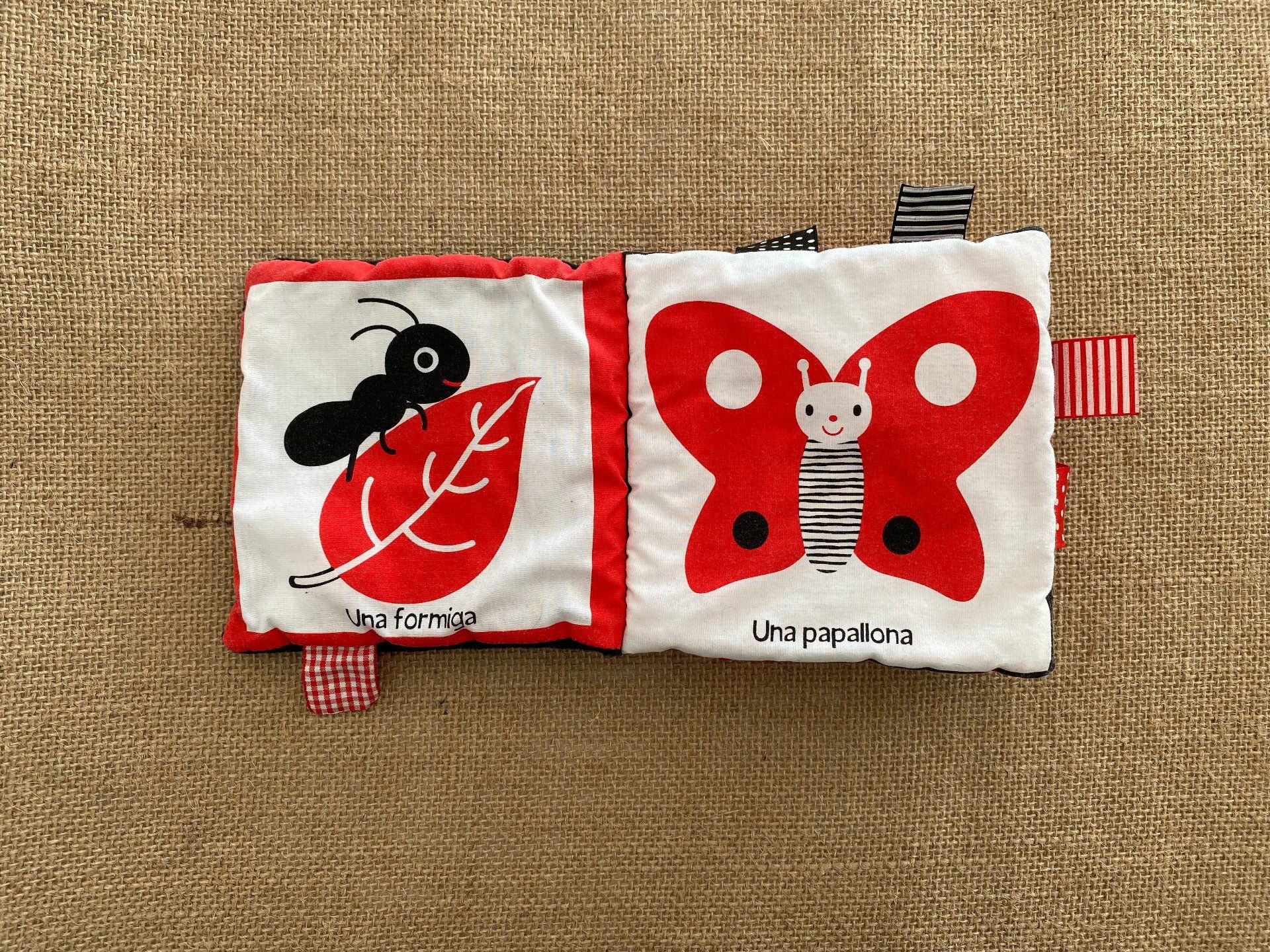 Livre en tissu pour bébé aux couleurs contrastées rouge noir et blanc, idéal pour stimuler la vue dès le plus jeune âge.