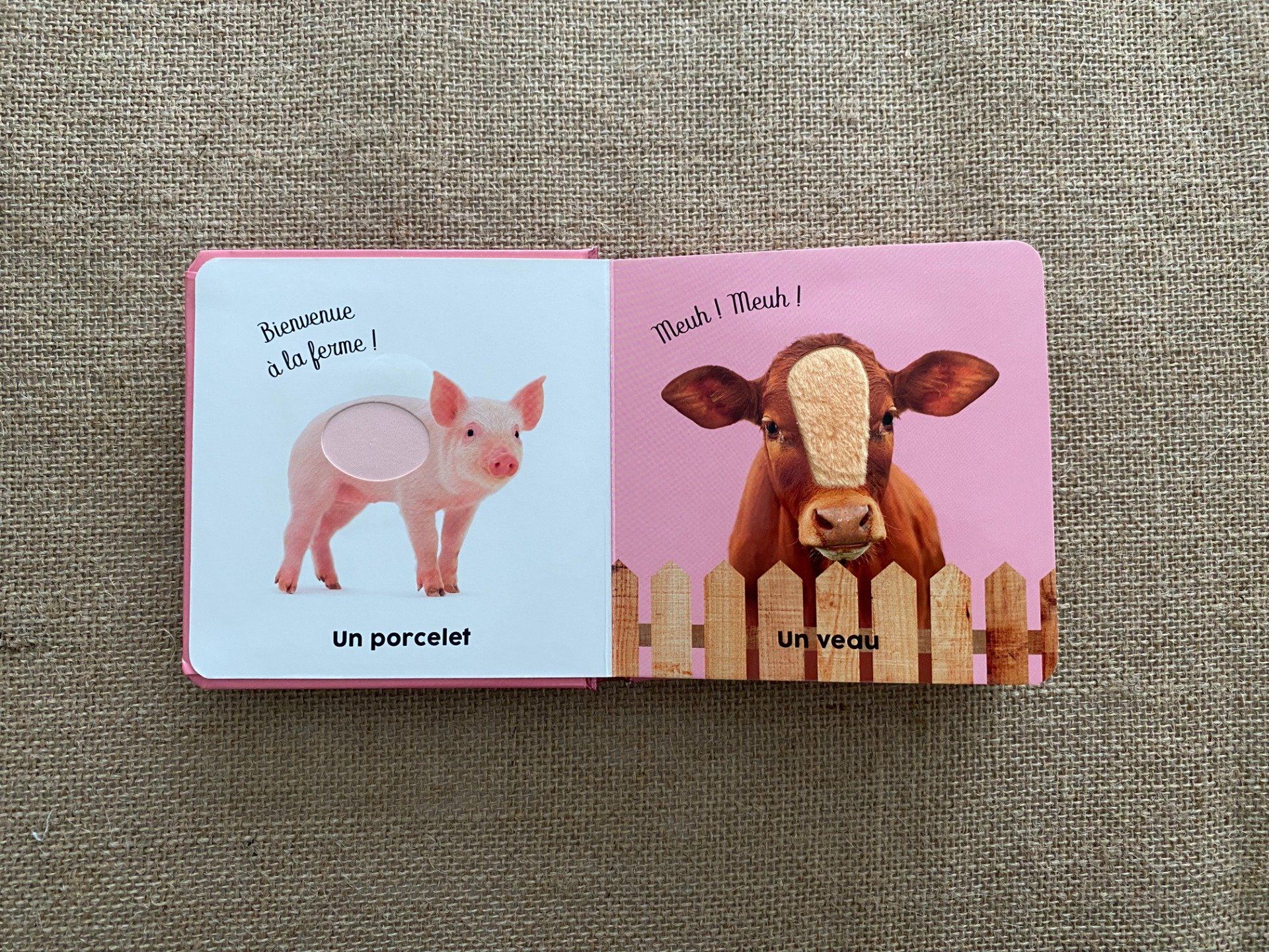 Livre cartonné tactile Langue au chat, Les bébés de la ferme. Photos d’animaux avec mots et matières à toucher pour apprendre en s’amusant.