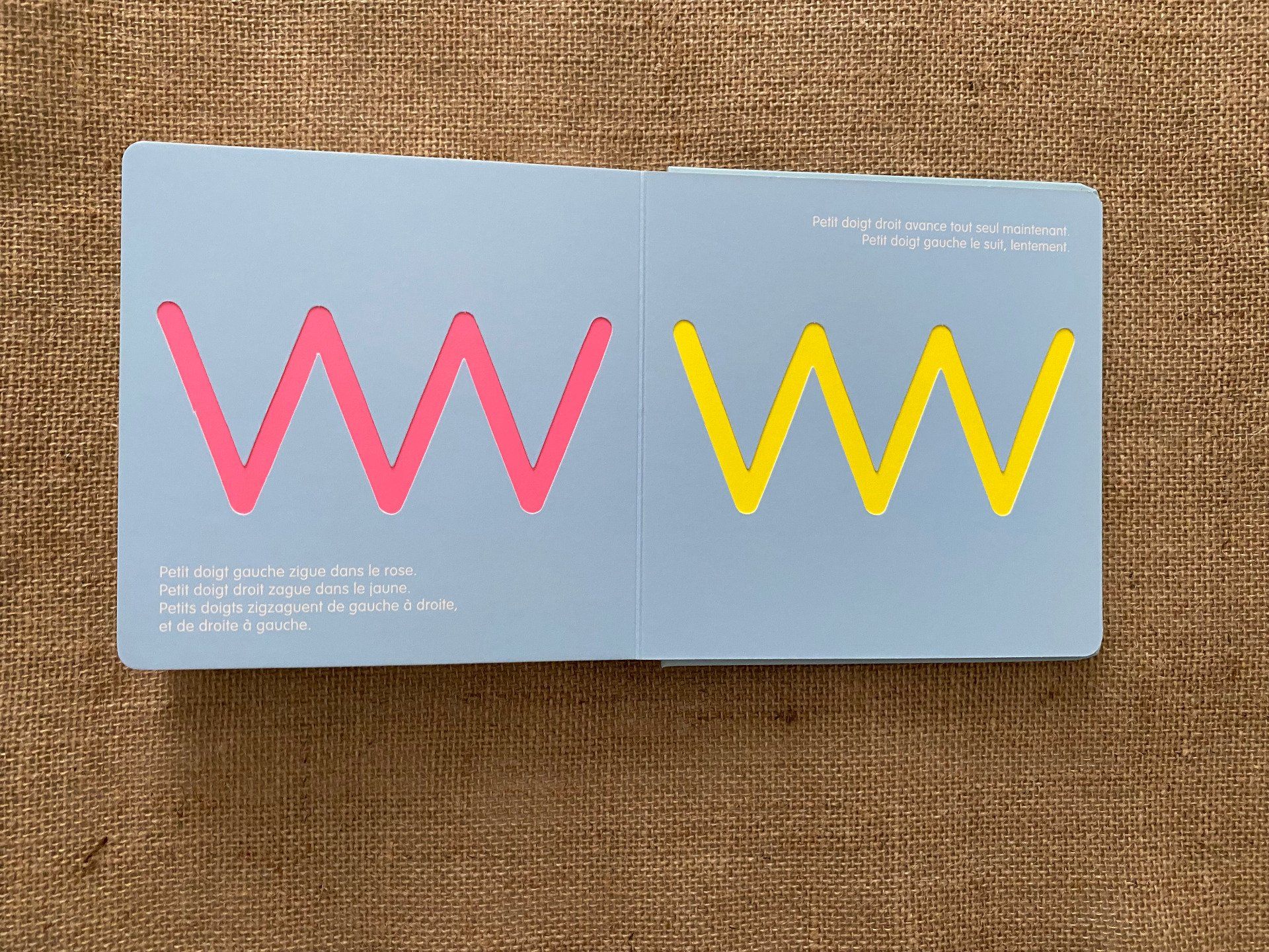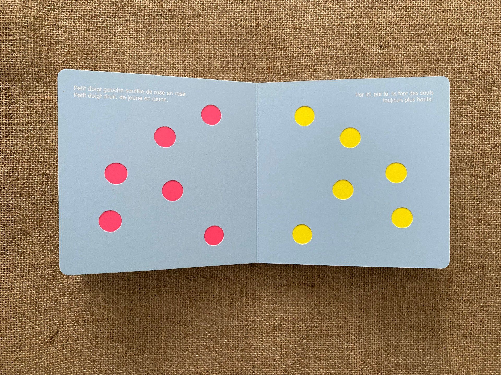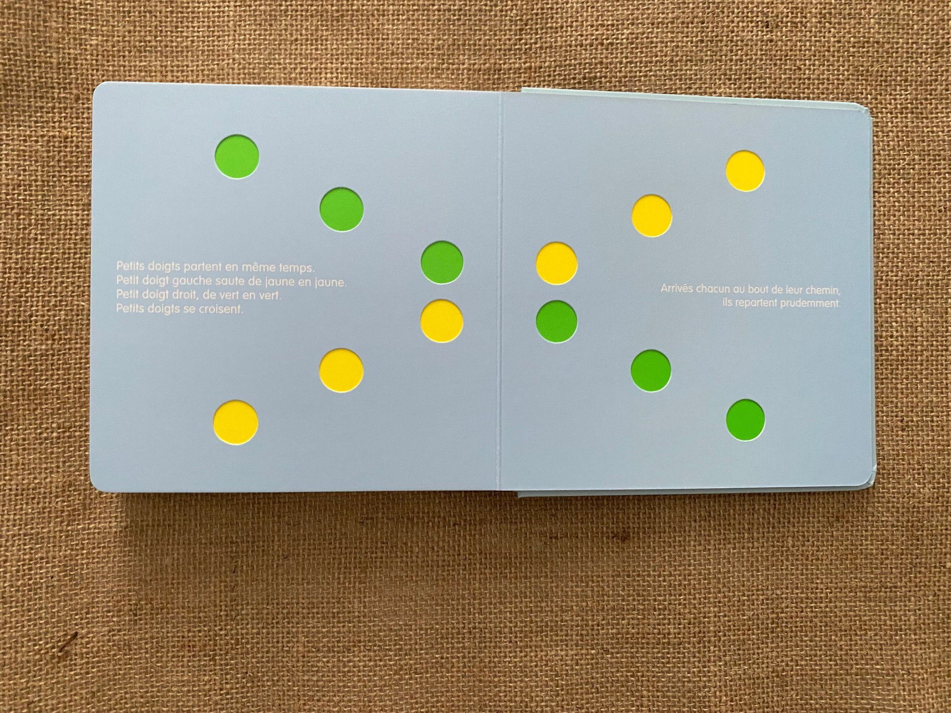 À chaque page, des formes colorées et creusées guident les petits doigts : l’un part à l’aventure dans le vert, l’autre se promène dans le rose… et bientôt, les doigts virevoltent, s’entrecroisent et inventent leurs propres chorégraphies.