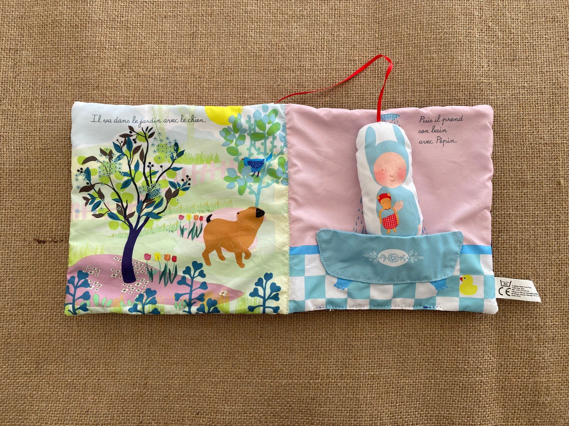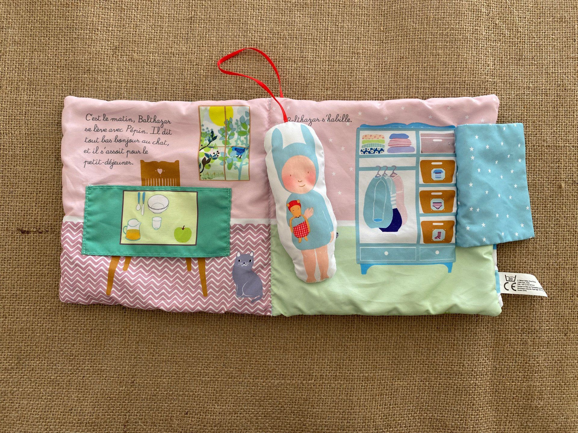 Un livre en tissu interactif pour faire découvrir à bébé les moments clés de la journée en s’amusant avec Balthazar.