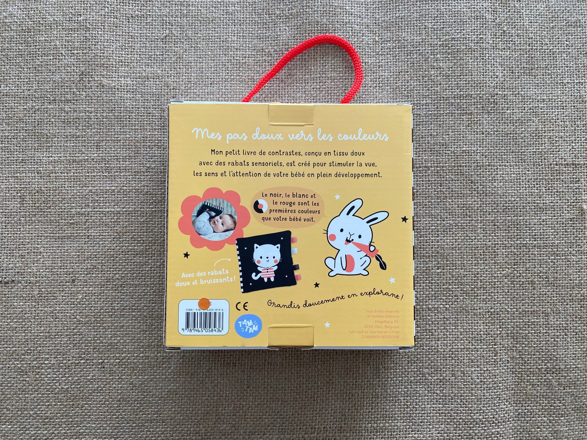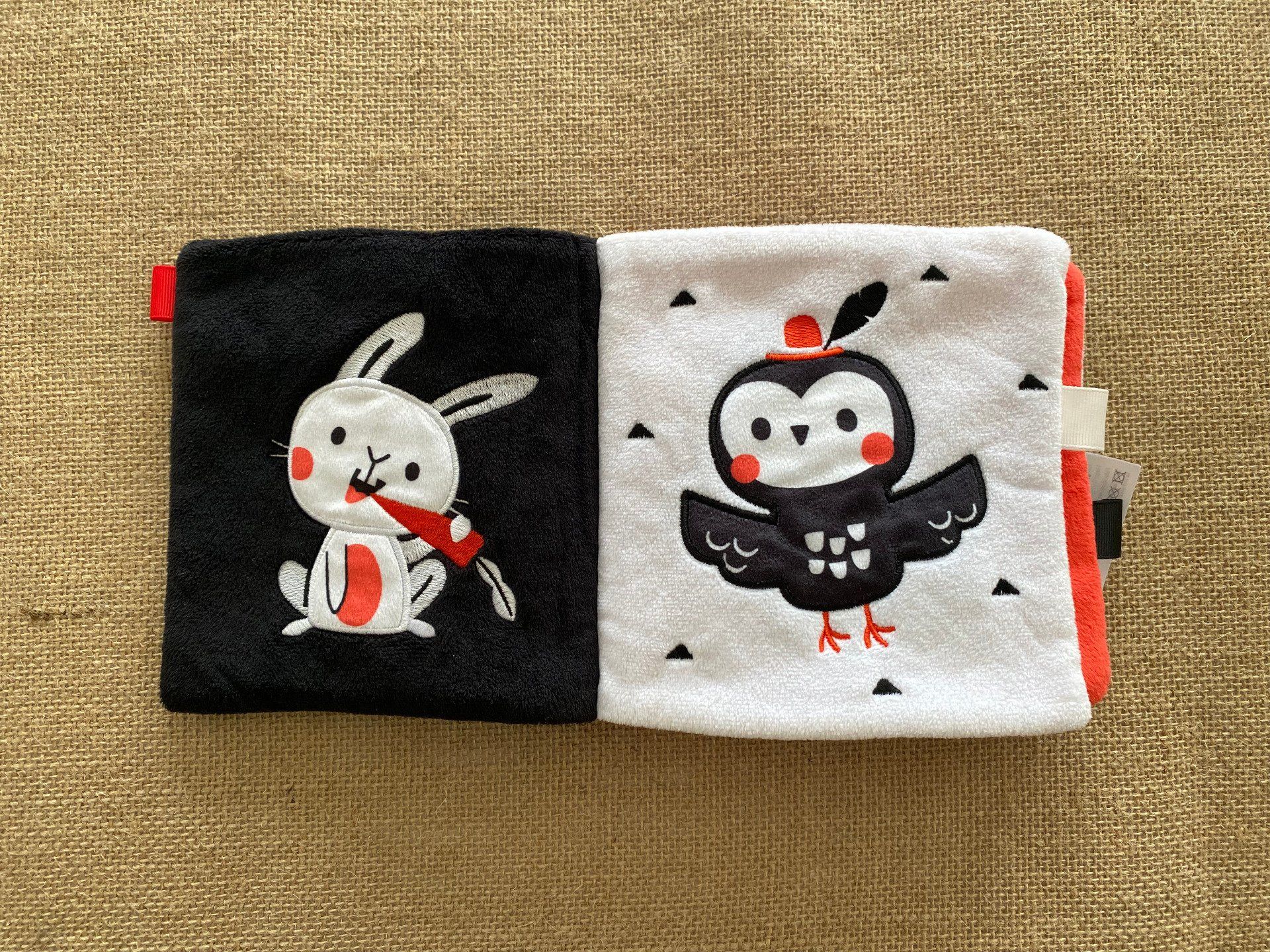 Avec ses contrastes noir, blanc et rouge, il stimule la vue de bébé, ces couleurs étant les premières qu’il perçoit. Les petits rabats sensoriels invitent à la manipulation et favorisent l’attention ainsi que le développement sensoriel en douceur.
