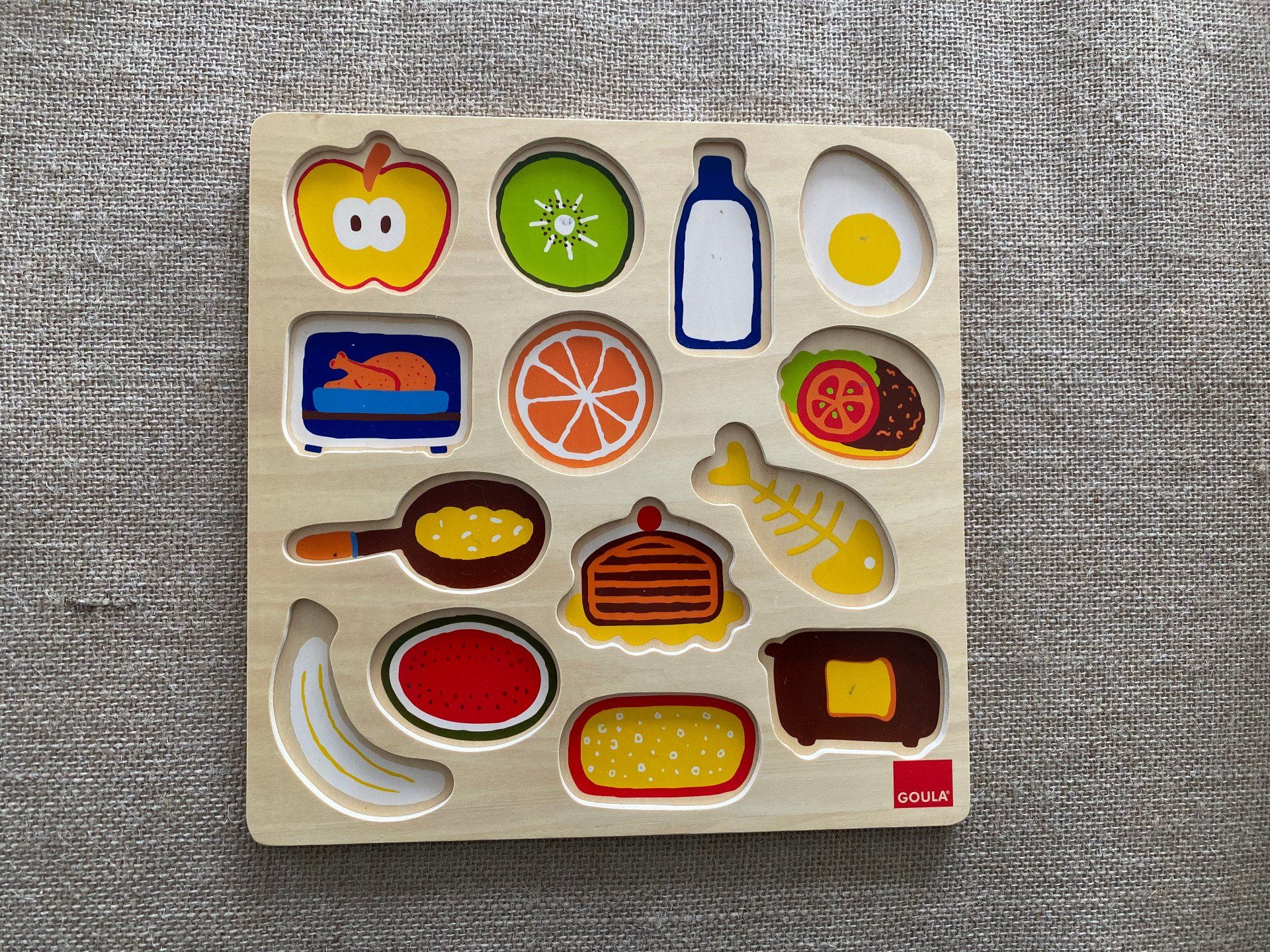 Puzzle Goula en bois, 14 pièces à encastrer. Dès 2 ans, parfait pour éveiller la curiosité et la motricité des enfants.