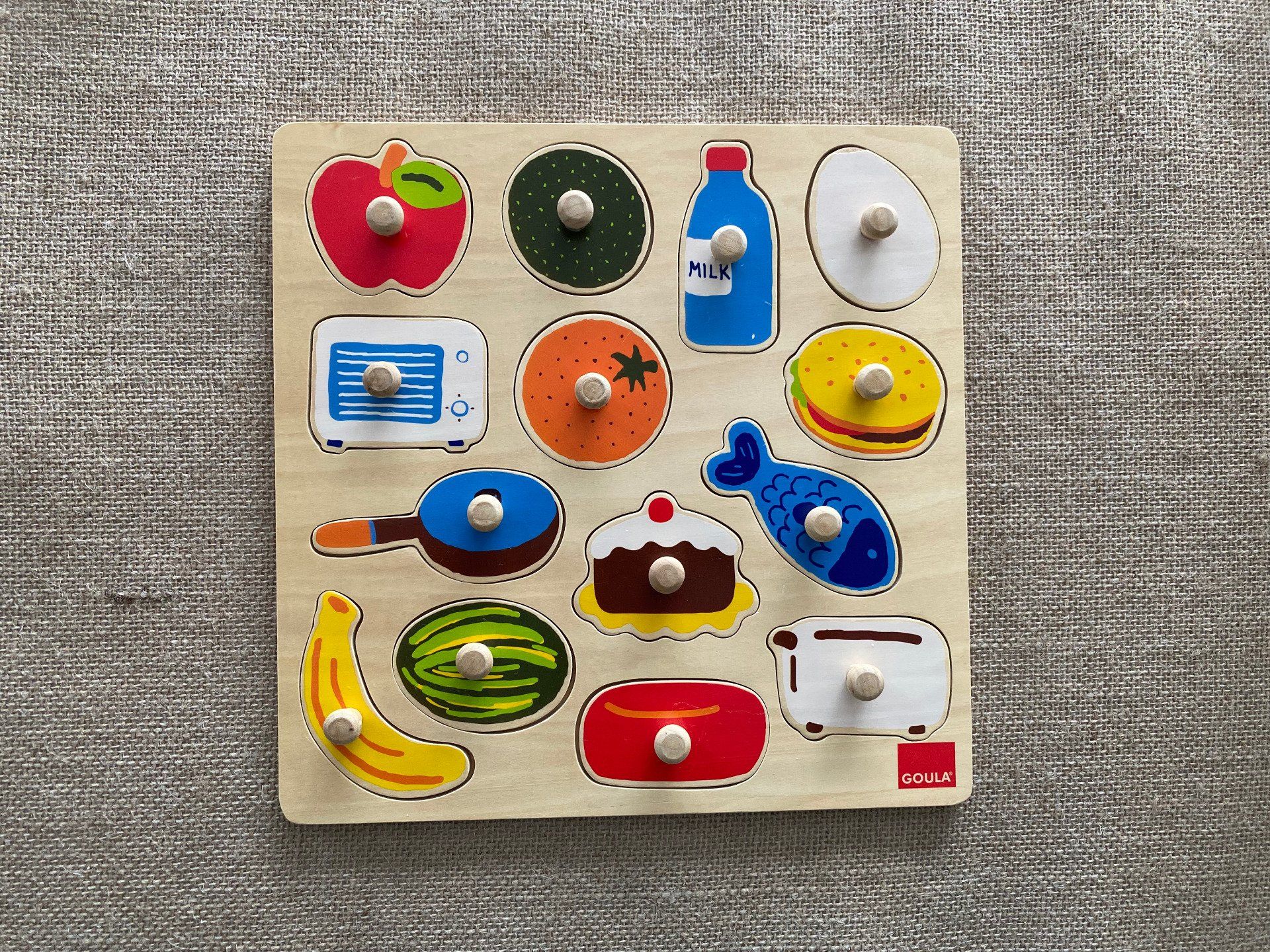 Ce puzzle à encastrement Goula comprend 14 pièces colorées faciles à manipuler par les petites mains.